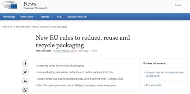 人均年產(chǎn)190公斤的包裝廢棄物!歐盟包裝出新規2024年4月24日,歐洲議會(huì )通過(guò)了新措施,使歐盟的包裝更具可持續性,并減少包裝浪費?! ≡摋l例以476票贊成,129票反對,24票棄權獲得通過(guò),旨在解決不斷增長(cháng)的廢物問(wèn)題,協(xié)調內部市場(chǎng)規則,促進(jìn)循環(huán)經(jīng)濟。但該協(xié)議需要得到安理會(huì )的正式批準,然后才能生效。圖片來(lái)源:europarl.europa.eu歐盟減少、再利用和回收包裝的新規則 1減少包裝并限制某些一次性塑料包裝 與理事會(huì )臨時(shí)商定的規則包括包裝減少目標(到2030年減少5%,到2035年減少10%,到2040年減少15%),并要求歐盟國家減少,特別是塑料包裝廢物的數量。為減少不必要的包裝,集團包裝、運輸包裝和電子商務(wù)包裝的最大空置率為50%;制造商和進(jìn)口商還必須確保將包裝的重量和體積降到最低。自 2030 年 1 月 1 日起,某些一次性塑料包裝將被禁止,例如未加工新鮮水果和蔬菜的包裝,咖啡館和餐館使用的食品和飲料包裝,獨立分量的包裝(如調味品、醬汁、奶精、糖),住宿用洗漱用品的微型包裝和非常輕的塑料手提袋(低于 15 微米)。為了防止對健康產(chǎn)生不利影響,該文本包括禁止在食品接觸包裝中使用超過(guò)一定閾值的所謂“永久化學(xué)品”(全氟和多氟烷基物質(zhì)或PFAS)?! ?鼓勵消費者選擇重復使用和補充 針對酒精和非酒精飲料包裝(例如牛奶、葡萄酒、芳香葡萄酒和烈酒除外)、運輸和銷(xiāo)售包裝以及分組包裝,預計將制定具體的2030年再利用目標。成員國可以在某些條件下給予五年的豁免。飲料和外賣(mài)食品的最終分銷(xiāo)商必須為消費者供自帶容器的選擇。到2030年,他們還將努力為10%的產(chǎn)品提供可重復使用的包裝。在一份相關(guān)公告中,Oceana呼吁飲料生產(chǎn)商改用可重復使用的包裝?! ?可回收包裝,更好的廢棄物收集和回收 根據新規定,所有包裝(輕質(zhì)木材、軟木、紡織品、橡膠、陶瓷、瓷器和蠟除外)必須符合嚴格的標準,可回收利用。措施還包括塑料包裝的最低回收含量目標和按包裝廢物重量計算的最低回收目標。到 2029 年,90% 的一次性塑料和金屬飲料容器(不超過(guò) 3 升)將不得不單獨收集(通過(guò)押金返還系統或其他確保達到收集目標的解決方案)?!霸诃h(huán)境法中,歐盟首次設定了減少包裝的目標,而不管使用的是什么材料,”報告員fracimacrique Ries (Renew, BE)說(shuō)?!靶乱幎ü膭顒?chuàng )新,并包括對微型企業(yè)的豁免。禁止在食品包裝中使用永久化學(xué)物質(zhì)是歐洲消費者健康的一大勝利。我們現在呼吁所有工業(yè)部門(mén)、歐盟國家和消費者在反對過(guò)度包裝的斗爭中發(fā)揮自己的作用?!? 2024-05-31 【節能環(huán)?!?/div>